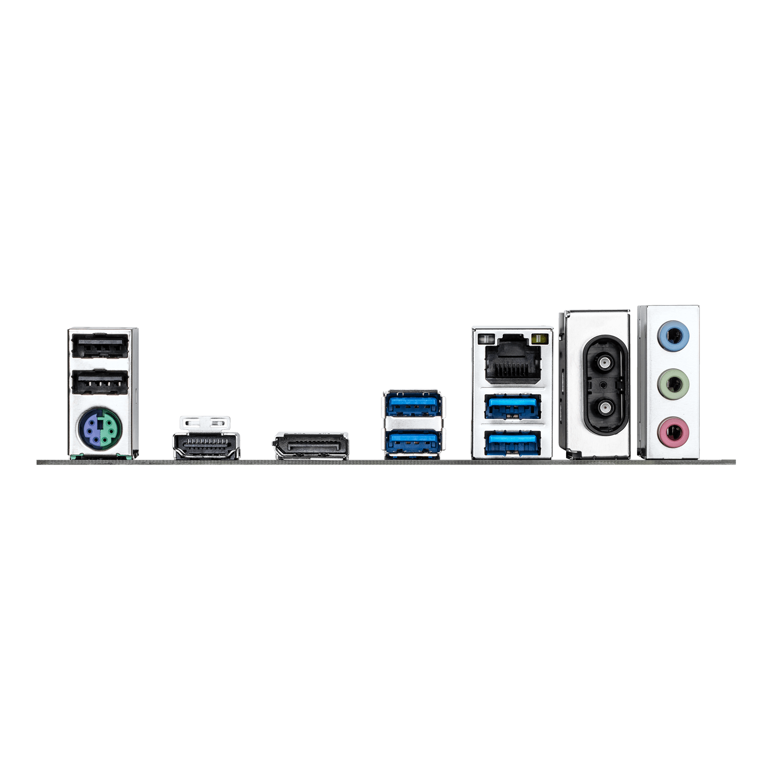 2 x USB 2.0/1.1 ports 1 x PS/2 keyboard/mouse port 1 x HDMI port (Note) 1 x DisplayPort (Note) 4 x USB 3.2 Gen 1 ports 1 x RJ-45 port 2 x antenna connectors 3 x audio jacks (Note) Actual support may vary by CPU. |