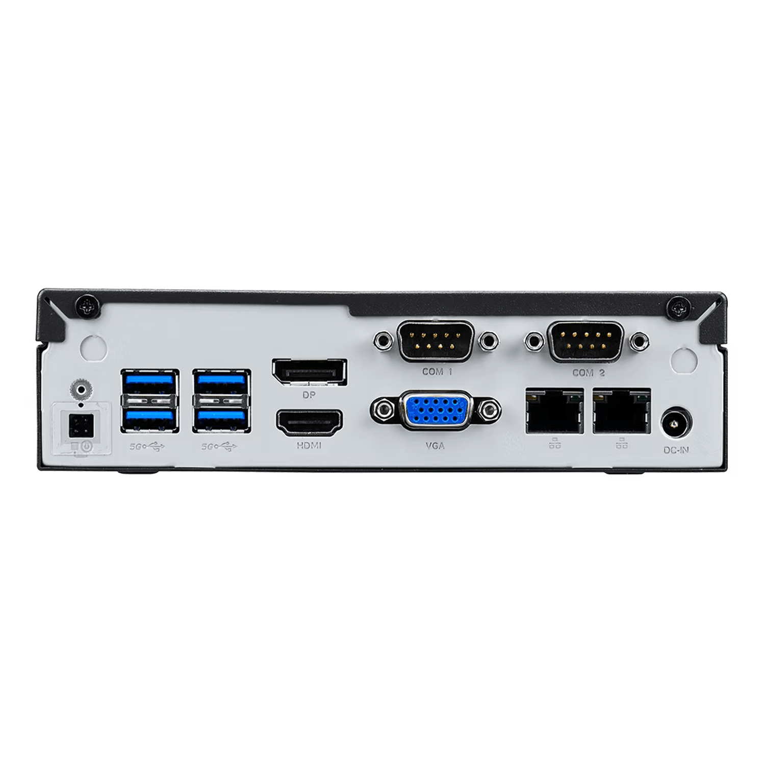 (2) Intel® 2.5 Gigabit LAN w/ LED (1) HDMI 2.0b (1) DisplayPort 1.4a (1) VGA (4) USB 3.2 Gen 1 (1) External power on/Clear CMOS header (2) Antenna hole (1) DC-in (1) RS232/RS422/RS485 (1) RS232 |